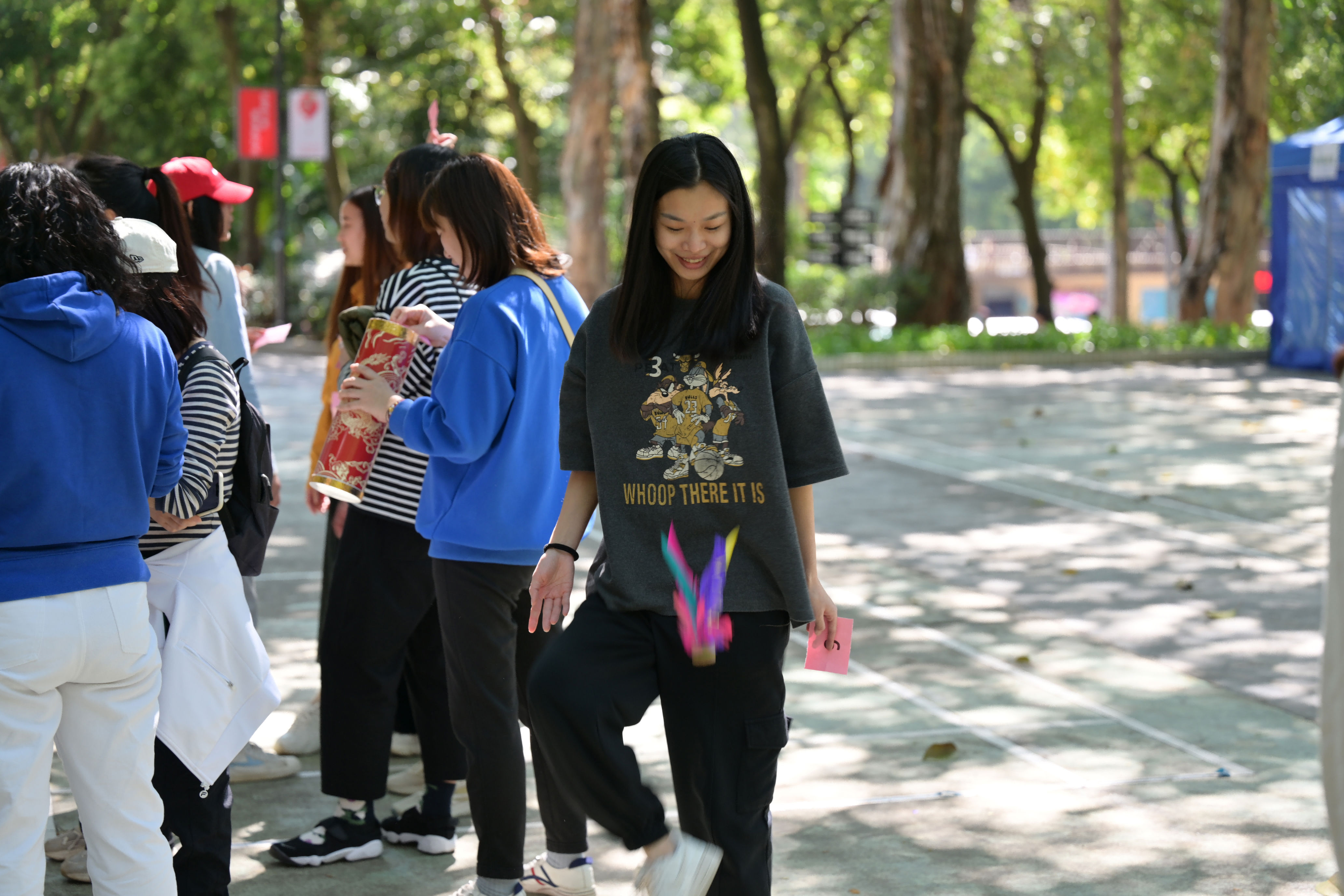 在明珠樓廣場開展團(tuán)隊踢毽子比賽,以組為單位爭相競技,五彩的毽子 在腳尖上輕盈飛舞,此起彼伏, 賽場上氣氛歡快激烈,不時迎陣陣喝彩。