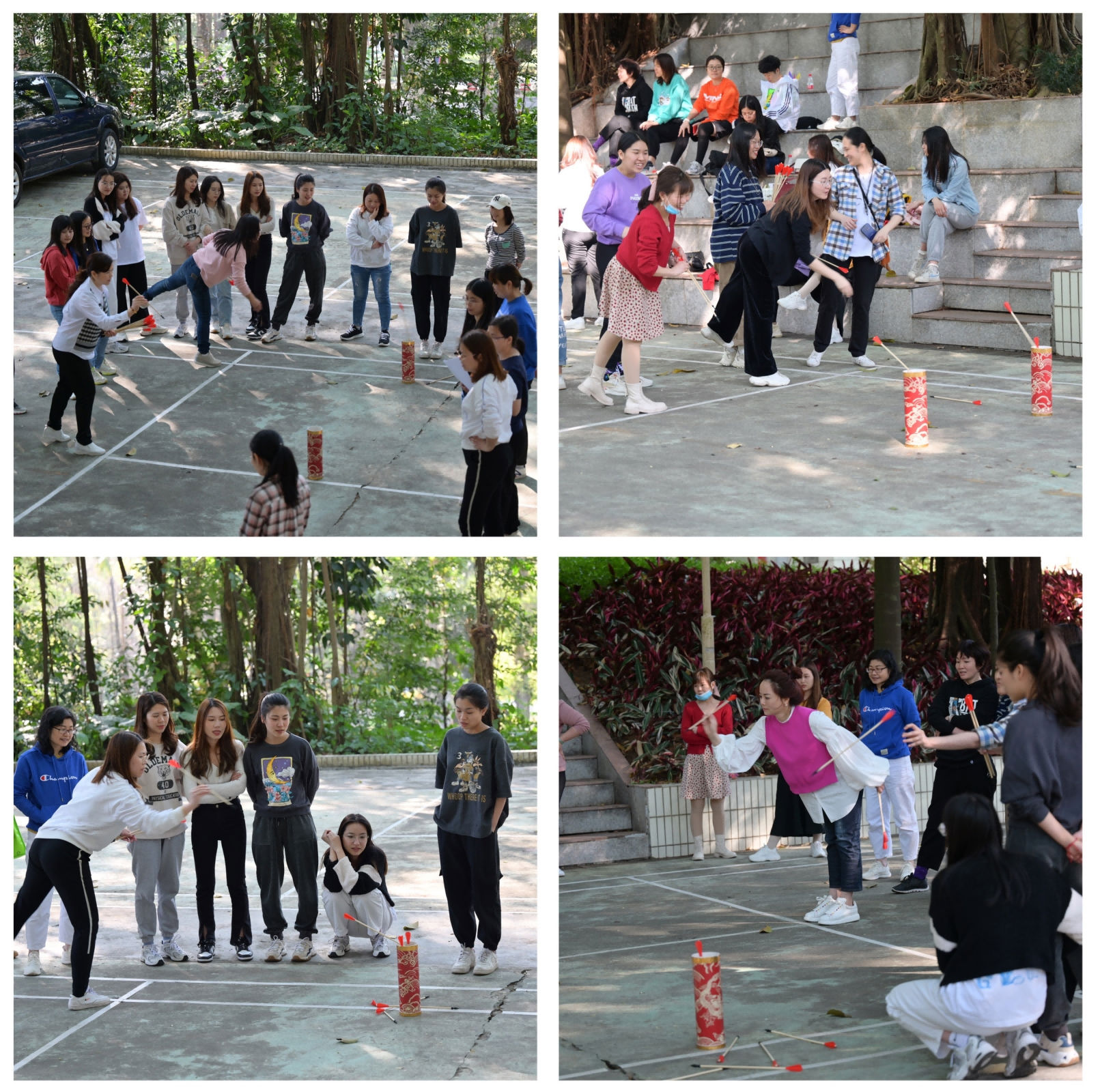 古人風(fēng)雅,曲水流觴、投壺射箭。緊張刺激的戶外投壺比賽開始,女同胞站在指定線上找尋最好的角度將箭拋出,期待自己每一箭都能投入壺中。每一次精準(zhǔn)命中,便會引來掌聲歡呼,如能連中更是“哇”聲不斷, 精彩連連,偶有一次遺憾出壺,同樣會引來一片惋惜感嘆。