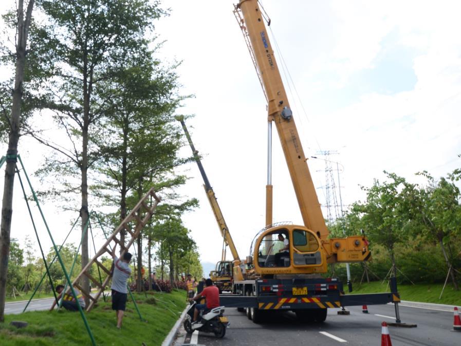 增城區(qū)創(chuàng)譽路建成通車不久,此次臺風(fēng)導(dǎo)致大量新植樹木被連根拔起。為提高被臺風(fēng)吹倒的樹木的存活率,搶修人員與時間賽跑,不辭辛勞,連夜作戰(zhàn),在盡可能短的時間內(nèi)將綠化樹木剪枝、扶正,最大限度保證成活率。